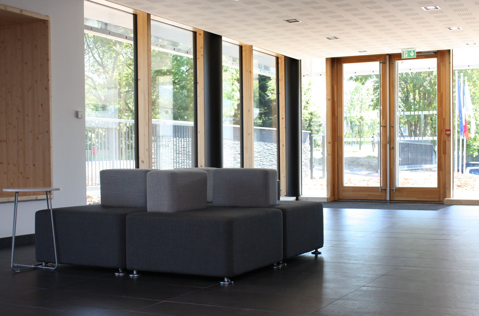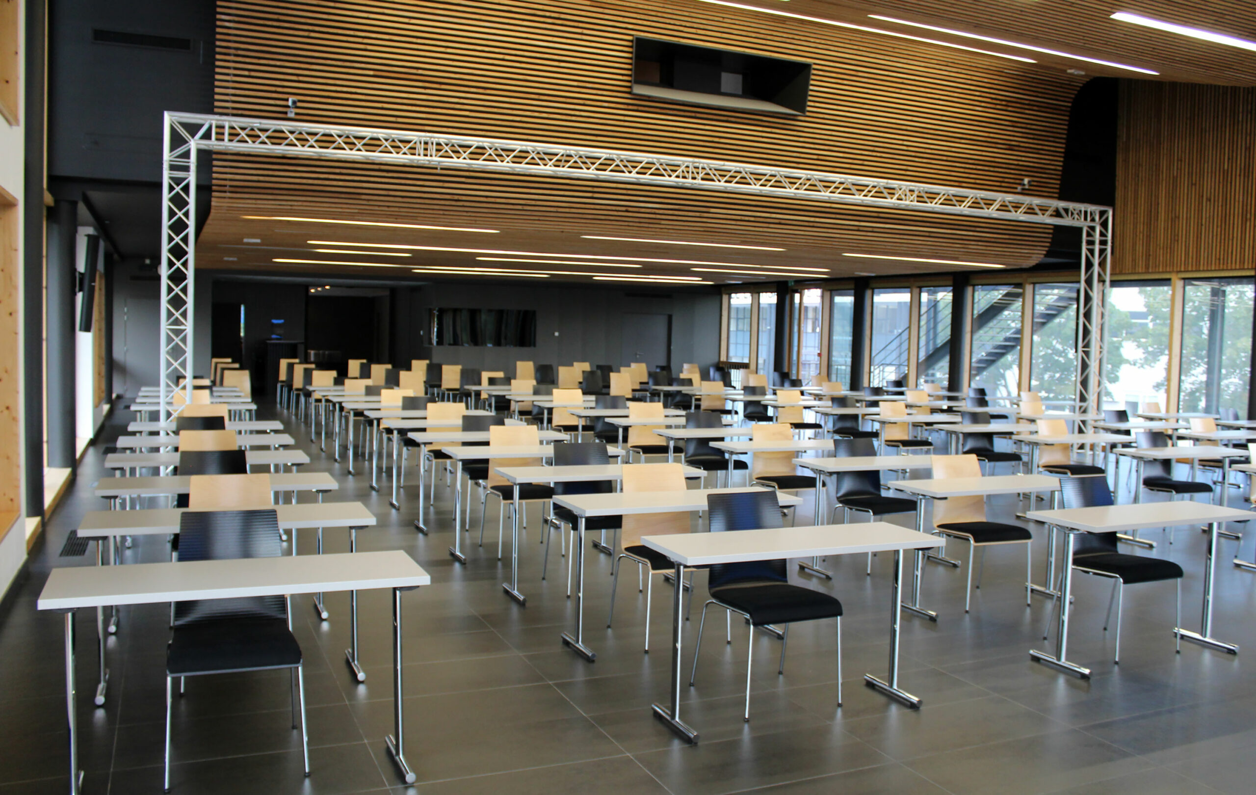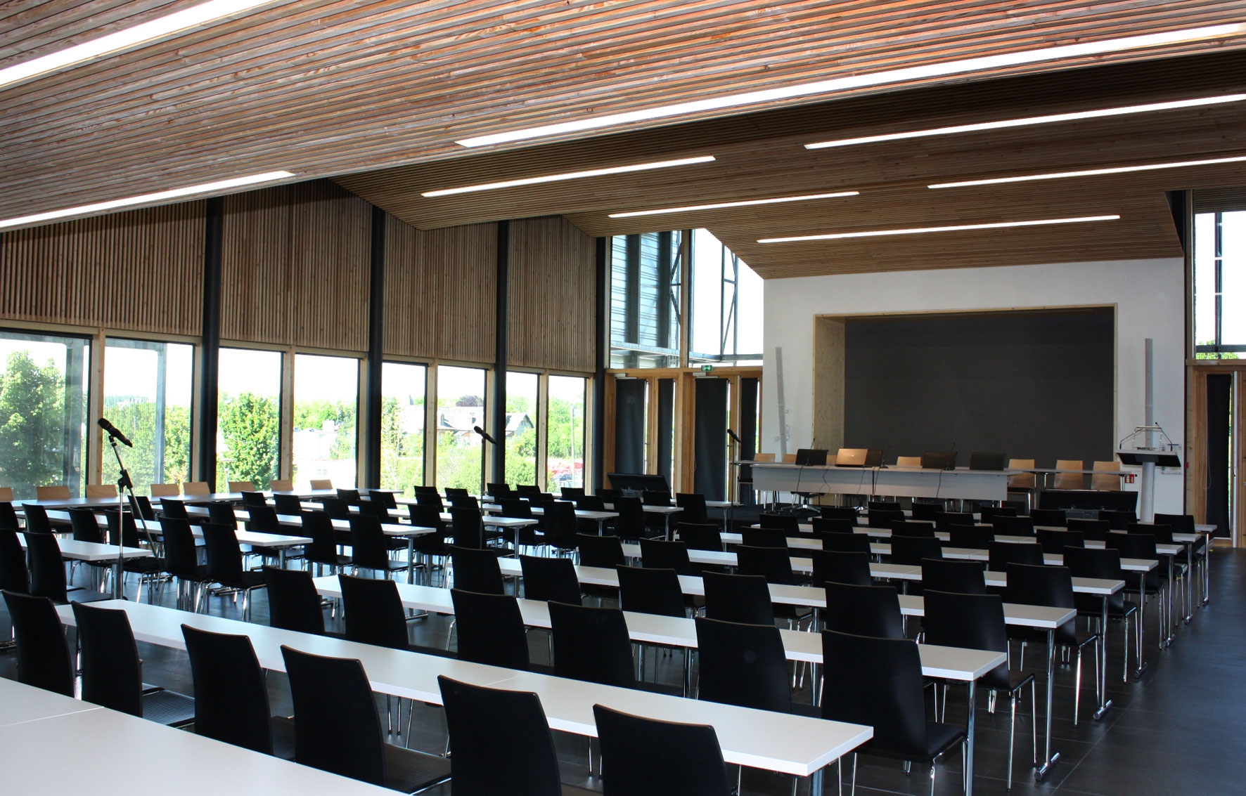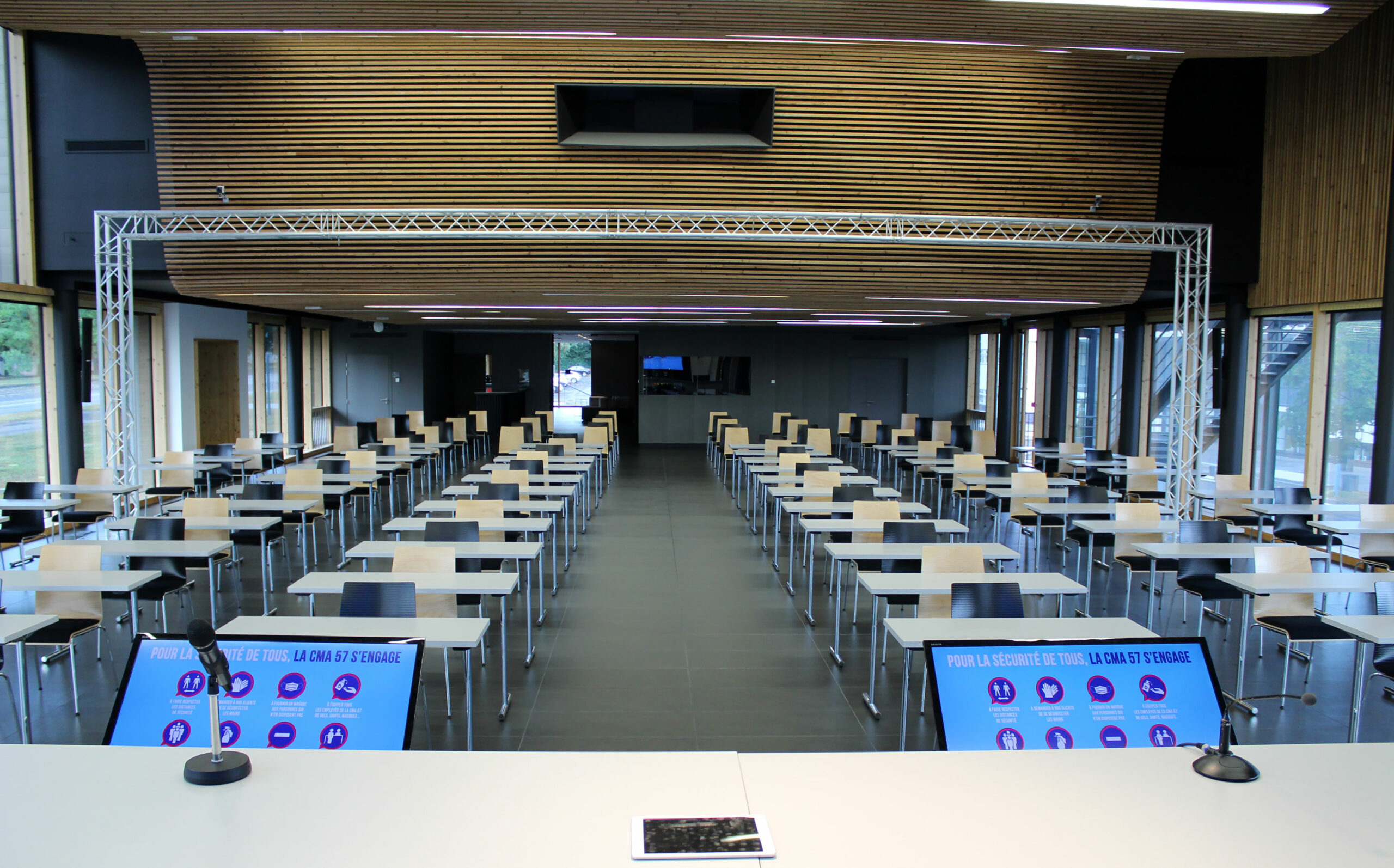 - Atouts : Hall d’accueil avec vestiaire, estrade modulable, pupitre